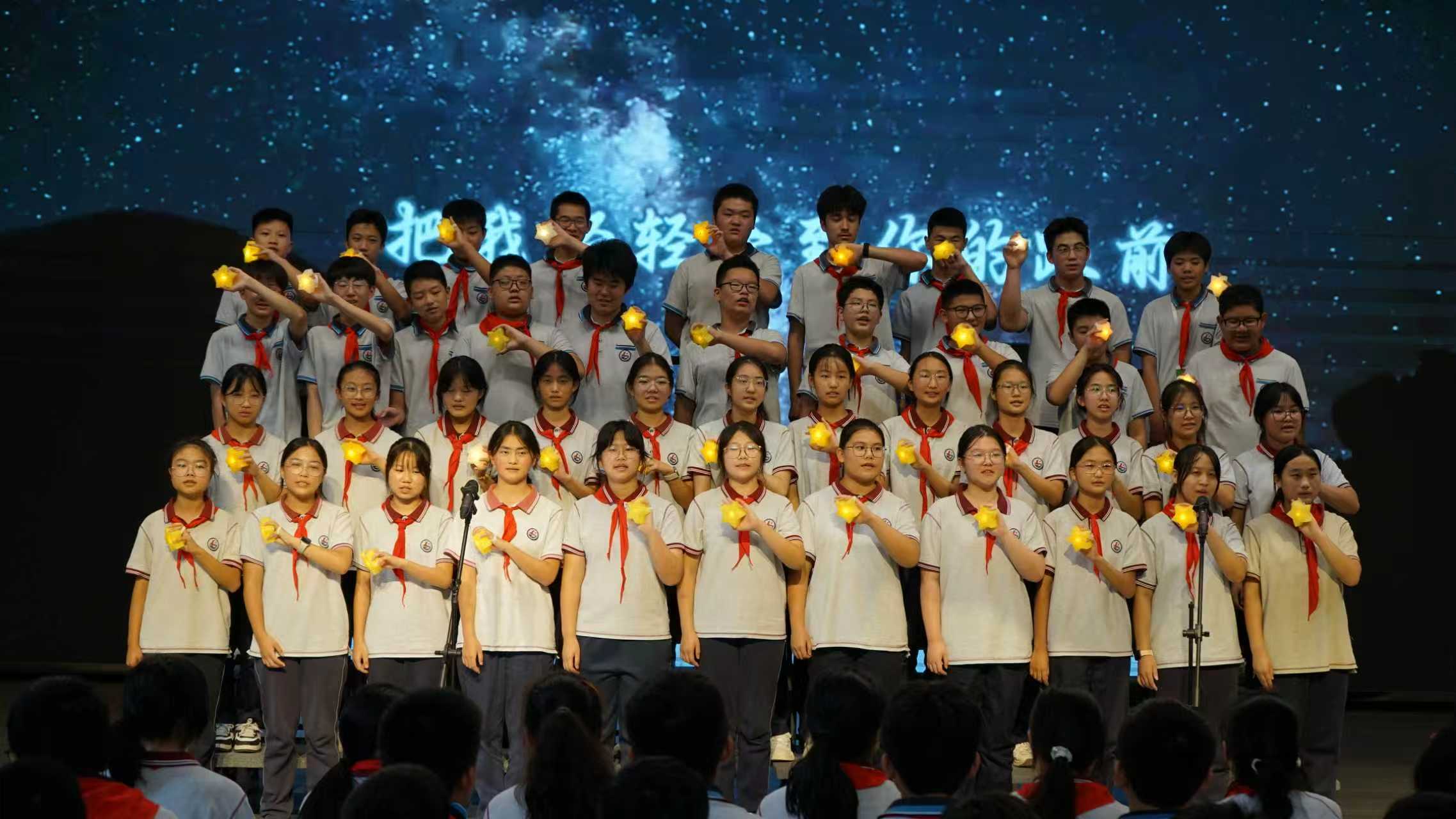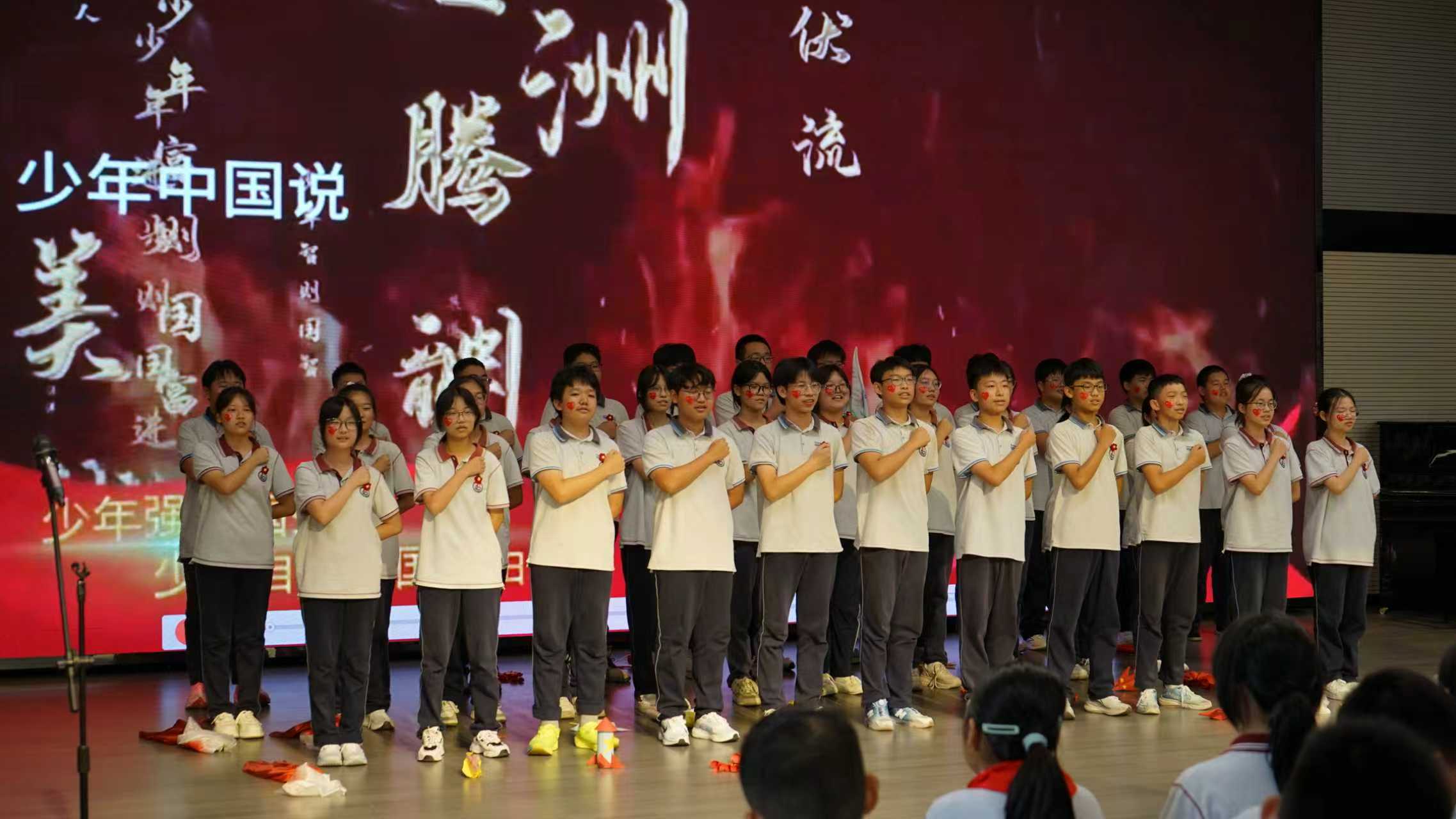 下午 1时 30 分,合唱在雄壮的《义勇军进行曲》中拉开帷幕。伴随着主持人热情洋溢的开场,各班代表队依次登场。只见七(3)班的同学们身着整齐的白色衬衫,手持闪烁的星星道具与小红旗,先后带来《夜空中最亮的星》与《我和我的祖国》两首歌曲。当 “夜空中最亮的星,请照亮我前行”的温柔旋律响起时,台下瞬间安静下来,同学们轻轻挥动手中的道具,仿佛将校园化作璀璨星河;随后旋律一转,“我和我的祖国,一刻也不能分割” 的深情咏唱接力响起,熟悉的曲调迅速点燃全场气氛,台下师生纷纷跟唱,掌声与欢呼声此起彼伏。 随后,《没有共产党就没有新中国》《歌唱祖国》等经典红歌轮番上演,各班各展所长,用多样的形式诠释对祖国的热爱。九年级(2)班则以恢弘的合唱阵容搭配铿锵有力的肢体动作,先后演唱《少年中国说》与《我爱你中国》。“少年智则国智,少年富则国富” 的激昂朗诵与合唱交织,展现出新时代少年的蓬勃朝气;紧接着,“我爱你中国,心爱的母亲” 的深情旋律缓缓流淌,同学们眼中满含真挚情感,饱满的歌声直抵人心,让不少师生热泪盈眶。